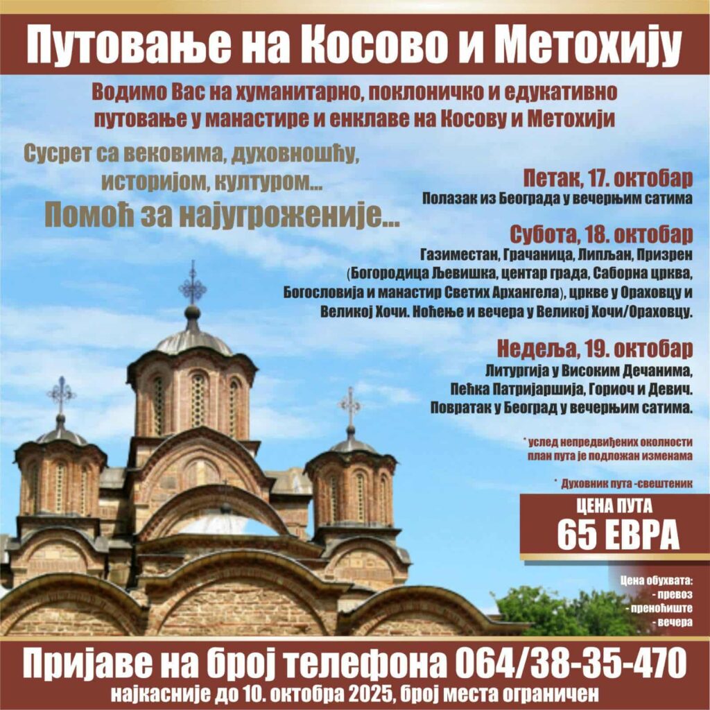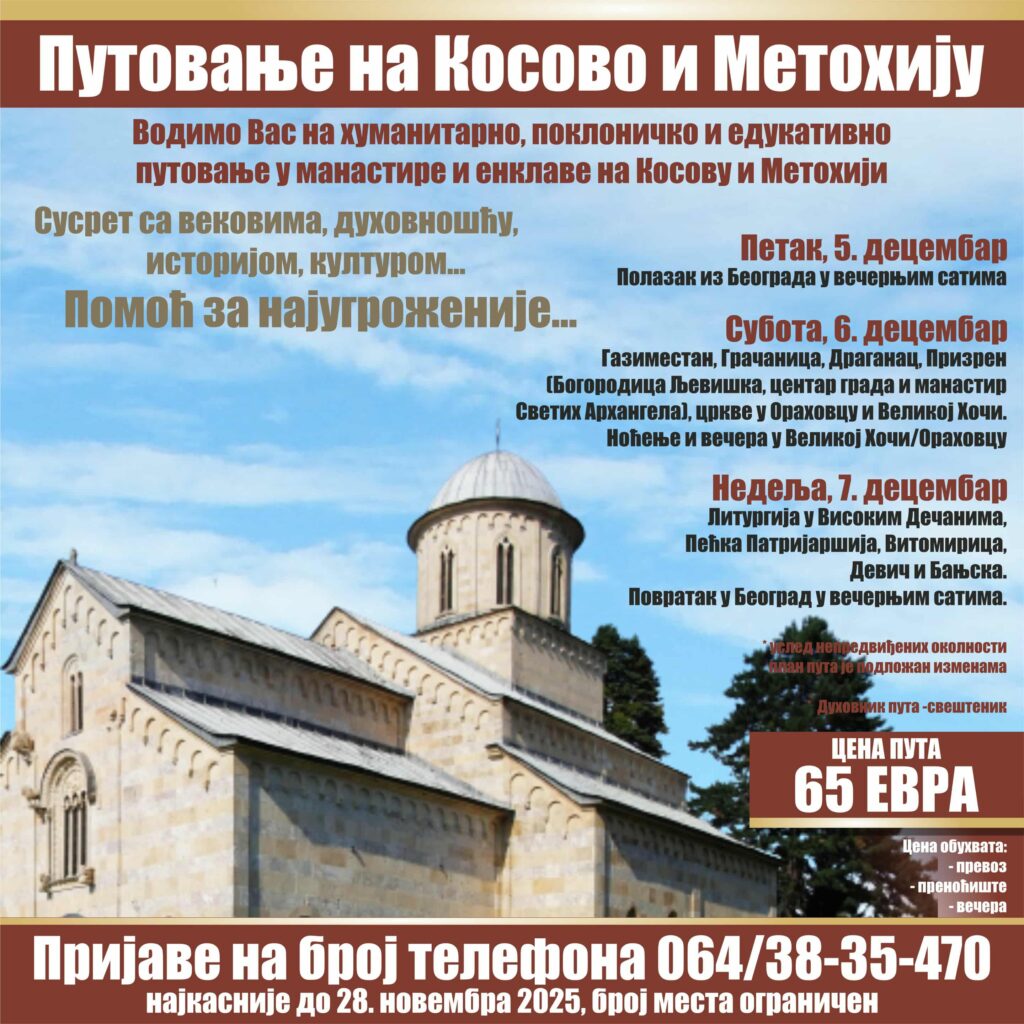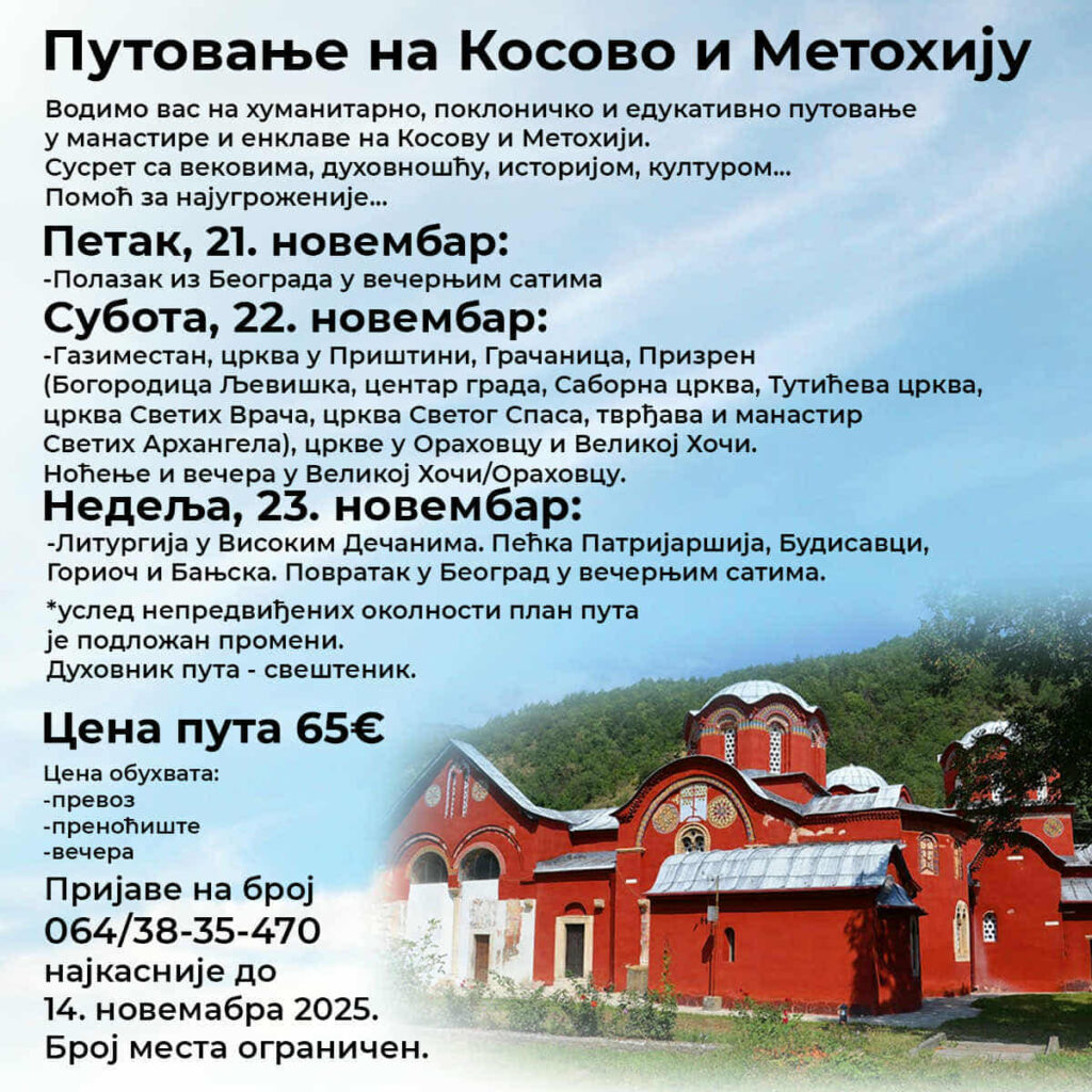 Пођите на хуманитарно и ходочасно путовање на Косово и Метохију, које има за циљ посету нашим светињама и угроженом народу. Полазак је у петак из Београда, а повратак у ноћи између недеље и понедељка.